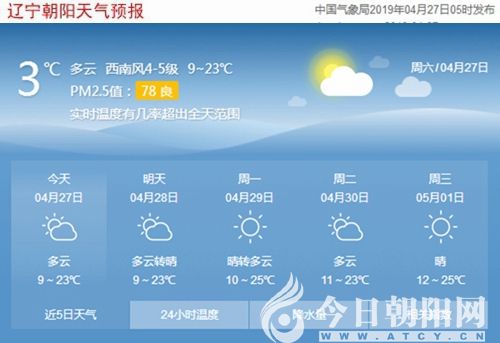 今天是2019年4月27日,星期六,農(nóng)歷三月二十三。遼寧朝陽(yáng)多云,氣溫9~23℃,西南風(fēng)4~5級(jí),空氣質(zhì)量良好。日出時(shí)間:05:03;日落時(shí)間:18:50。