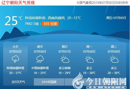 今天是2019年7月5日,星期五,農(nóng)歷六月初三。遼寧朝陽(yáng)陣雨轉(zhuǎn)雷陣雨,氣溫20~31℃,西南風(fēng)微風(fēng),空氣質(zhì)量輕度污染。日出時(shí)間:04:29;日落時(shí)間:19:35。(數(shù)據(jù)來源于中國(guó)氣象局2019年07月05日05時(shí)發(fā)布,請(qǐng)隨時(shí)關(guān)注天氣變化)