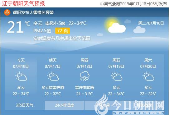 今天是2019年7月16日,星期二,農(nóng)歷六月十四,初伏第五天。遼寧朝陽多云,氣溫22~34℃,南風(fēng)4~5級,空氣質(zhì)量良好。日出時(shí)間:04:36;日落時(shí)間:19:31。(數(shù)據(jù)來源于中國氣象局2019年07月16日05時(shí)發(fā)布,請隨時(shí)關(guān)注天氣變化)