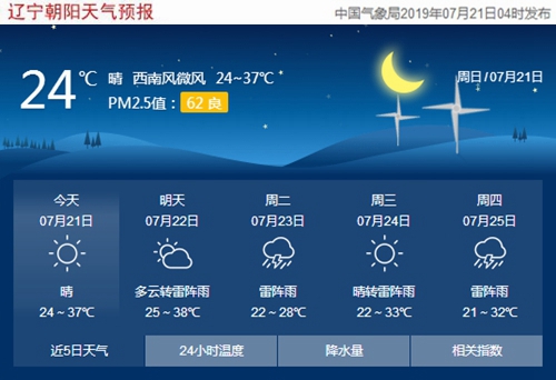 今天是2019年7月21日,星期日,農(nóng)歷六月十九,初伏第十天。遼寧朝陽晴,氣溫24~37℃,北風(fēng)3~5級,空氣質(zhì)量良好。日出時間:04:41;日落時間:19:27。(數(shù)據(jù)來源于中國氣象局2019年07月21日04時發(fā)布,請隨時關(guān)注天氣變化)