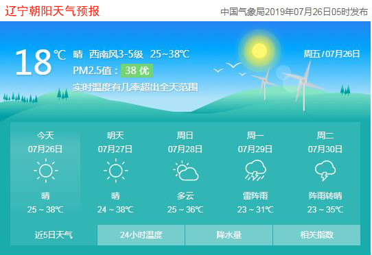 今天是2019年7月26日,星期五,農(nóng)歷六月二十四,中伏第五天。遼寧朝陽(yáng)晴,氣溫25~38℃,西南風(fēng)3~5級(jí),空氣質(zhì)量?jī)?yōu)。日出時(shí)間:04:45;日落時(shí)間:19:23。(數(shù)據(jù)來(lái)源于中國(guó)氣象局2019年07月26日05時(shí)發(fā)布,請(qǐng)隨時(shí)關(guān)注天氣變化)