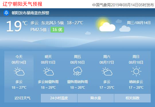 今天是2019年8月14日,星期三,農(nóng)歷七月十四,末伏第四天。遼寧朝陽(yáng)多云,氣溫18~27℃,東北風(fēng)3~5級(jí),空氣質(zhì)量?jī)?yōu)。日出時(shí)間:05:04;日落時(shí)間:19:01。(數(shù)據(jù)來(lái)源于中國(guó)氣象局2019年08月14日05時(shí)發(fā)布,請(qǐng)隨時(shí)關(guān)注天氣變化。)