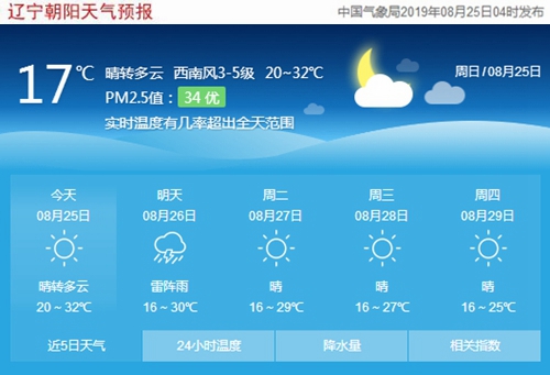 今天是2019年8月25日,星期日,農(nóng)歷七月二十五。遼寧朝陽晴轉多云,氣溫20~32℃,西南風3~5級,空氣質量優(yōu)。日出時間:05:15;日落時間:18:45。(數(shù)據(jù)來源于中國氣象局2019年08月25日04時發(fā)布,請隨時關注天氣變化。)
