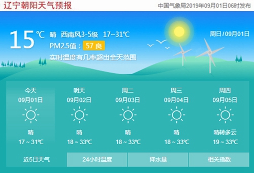今天是2019年9月1日,星期日,農(nóng)歷八月初三。遼寧朝陽晴,氣溫17~31℃,西南風(fēng)3~5級,空氣質(zhì)量良。日出時(shí)間:05:22;日落時(shí)間:18:34。(數(shù)據(jù)來源于中國氣象局2019年09月01日06時(shí)發(fā)布,請隨時(shí)關(guān)注天氣變化。)