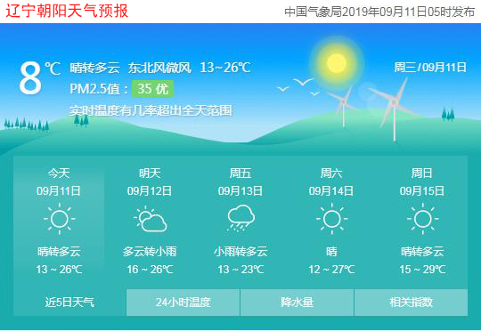 今天是2019年9月11日,星期三,農(nóng)歷八月十三。遼寧朝陽晴轉(zhuǎn)多云,氣溫13~26℃,東北風(fēng)微風(fēng),空氣質(zhì)量優(yōu)。日出時間:05:32;日落時間:18:17。(數(shù)據(jù)來源于中國氣象局2019年09月11日05時發(fā)布,請隨時關(guān)注天氣變化。)