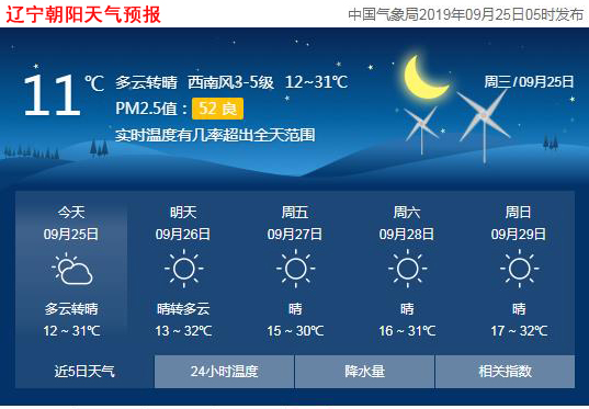 今天是2019年9月25日,星期三,農(nóng)歷八月二十七。遼寧朝陽(yáng)多云轉(zhuǎn)晴,氣溫12~31℃,西南風(fēng)3~5級(jí),空氣質(zhì)量良好。日出時(shí)間:05:46;日落時(shí)間:17:53。(數(shù)據(jù)來(lái)源于中國(guó)氣象局2019年09月25日05時(shí)發(fā)布,請(qǐng)隨時(shí)關(guān)注天氣變化。)