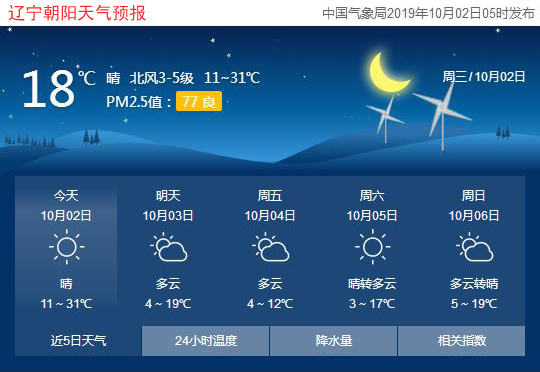 今天是2019年10月2日,星期三,農(nóng)歷九月初四。遼寧朝陽(yáng)晴,氣溫11~31℃,西南風(fēng)3~5級(jí),空氣質(zhì)量良好。日出時(shí)間:05:54;日落時(shí)間:17:41。(數(shù)據(jù)來(lái)源于中國(guó)氣象局2019年10月02日05時(shí)發(fā)布,請(qǐng)隨時(shí)關(guān)注天氣變化。)