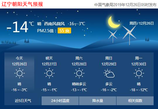 今天是2019年12月26日,星期四,農(nóng)歷臘月初一,一九第五天。遼寧朝陽(yáng),氣溫-16~-3℃,北風(fēng)微風(fēng),空氣質(zhì)量輕度污染。日出時(shí)間:07:23;日落時(shí)間:16:33(中國(guó)氣象局2019年12月26日5時(shí)發(fā)布),請(qǐng)隨時(shí)關(guān)注天氣變化。
