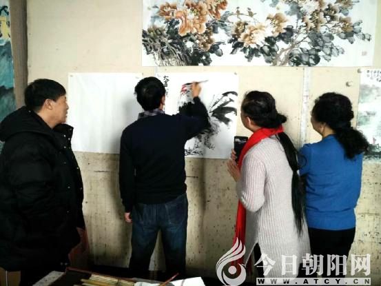 朝陽市、區(qū)文藝界的有關(guān)領(lǐng)導(dǎo),部分畫家、書法家、作家、詩人也來到了現(xiàn)場。大家熱情擁抱、握手相互祝福之后,便投身于創(chuàng)作之中,藝術(shù)家們興致勃勃,僅僅兩小時就創(chuàng)作了書畫作品百余幅。