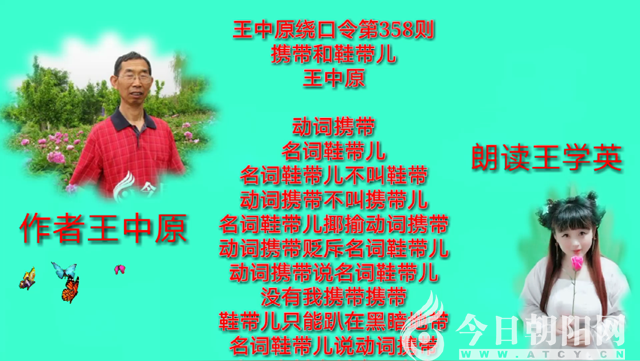 王中原,漢族,1947年生。函授中文??茖W歷,中學高級教師(已退休)。系今日朝陽網(wǎng)文化信使,中國楹聯(lián)學會會員,《咬文嚼字》雜志特約審校。曾為《語文學習》《演講與口才》等期刊業(yè)余審校數(shù)十年。近年撰寫繞口令300余則。個人原創(chuàng)繞口令專集《繞口令教你巧舌如簧》(趙立濤點評),被列入“新編播音員主持人訓練手冊”叢書,由中國傳媒大學出版社出版發(fā)行。