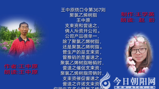 王中原,漢族,1947年生。函授中文專科學(xué)歷,中學(xué)高級(jí)教師(已退休)。系今日朝陽(yáng)網(wǎng)文化信使,中國(guó)楹聯(lián)學(xué)會(huì)會(huì)員,《咬文嚼字》雜志特約審校。曾為《語(yǔ)文學(xué)習(xí)》《演講與口才》等期刊業(yè)余審校數(shù)十年。近年撰寫繞口令300余則。個(gè)人原創(chuàng)繞口令專集《繞口令教你巧舌如簧》(趙立濤點(diǎn)評(píng)),被列入“新編播音員主持人訓(xùn)練手冊(cè)”叢書(shū),由中國(guó)傳媒大學(xué)出版社出版發(fā)行。