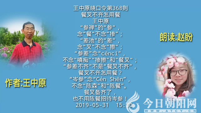 王中原,漢族,1947年生。函授中文??茖W(xué)歷,中學(xué)高級教師(已退休)。系今日朝陽網(wǎng)文化信使,中國楹聯(lián)學(xué)會會員,《咬文嚼字》雜志特約審校。曾為《語文學(xué)習(xí)》《演講與口才》等期刊業(yè)余審校數(shù)十年。近年撰寫繞口令300余則。個人原創(chuàng)繞口令專集《繞口令教你巧舌如簧》(趙立濤點評),被列入“新編播音員主持人訓(xùn)練手冊”叢書,由中國傳媒大學(xué)出版社出版發(fā)行。