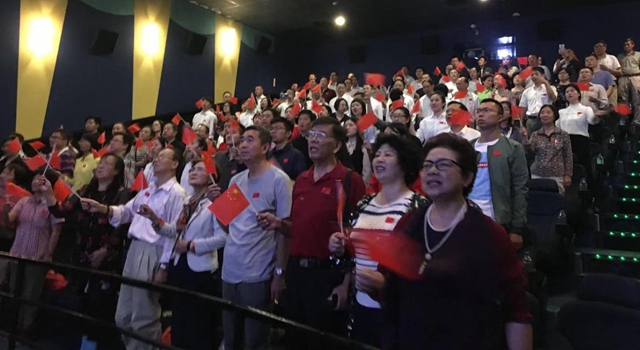 上午九點,100余位胸前貼著國旗的觀眾就在環(huán)球港的海上明珠影城排隊進場,直播正式開始前,更是發(fā)生了動人一幕,觀眾自發(fā)合唱起《我和我的祖國》,伴隨著齊心的歌聲,搖曳著的五星紅旗顯得分外動人。