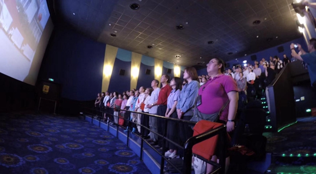此次直播是我國歷史上首次將4K超高清信號引入院線,實現(xiàn)直播技術(shù)與銀幕的完美融合,打通大事件在影院影廳平臺播放的通路。“每一幕都非常震撼,看著軍人們整齊劃一的動作和非凡的氣勢,自己仿佛身臨其境地在現(xiàn)場,”青年公務(wù)員王雅萍表示:“與在家里的電視機前看相比不僅是視覺效果的差異,大銀幕前大家聚在一起觀看閱兵式的氛圍更令人動容。”