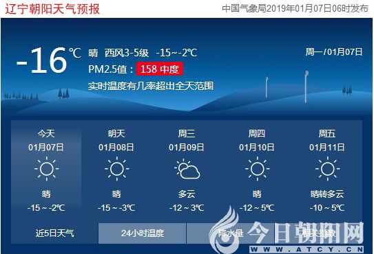 今天是2019年1月7日,星期一,農(nóng)歷臘月初二。遼寧朝陽(yáng)晴,氣溫-15~-2℃,西風(fēng)3~5級(jí)。日出時(shí)間:07:25;日落時(shí)間:16:43。