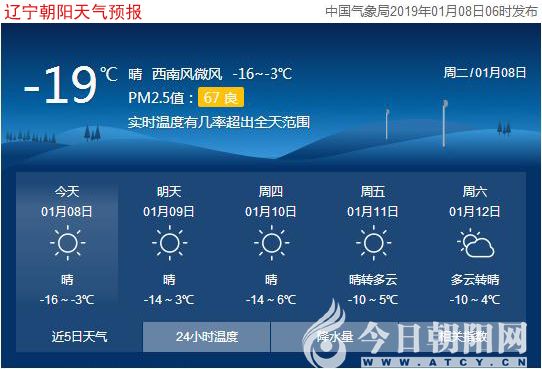 今天是2019年1月8日,星期二,農(nóng)歷臘月初三。遼寧朝陽晴,氣溫-16~-3℃,西北風(fēng)4~5級,空氣質(zhì)量良好。日出時(shí)間:07:25;日落時(shí)間:16:44。