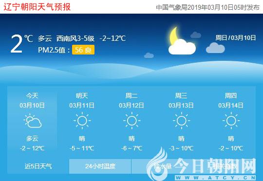 今天是2019年3月10日,星期日,農(nóng)歷二月初四,“九九”第七天。遼寧朝陽多云,氣溫-2~12℃,東風(fēng)微風(fēng),空氣質(zhì)量良好。日出時間:06:22;日落時間:17:58。
