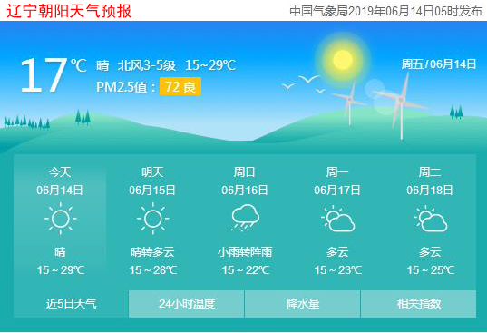 今天是2019年6月14日,星期五,農歷五月十二。遼寧朝陽晴,氣溫15~29℃,北風3~5級,空氣質量良好。日出時間:04:24;日落時間:19:33。(數(shù)據來源于中國氣象局2019年06月14日5時發(fā)布,請隨時關注天氣變化)