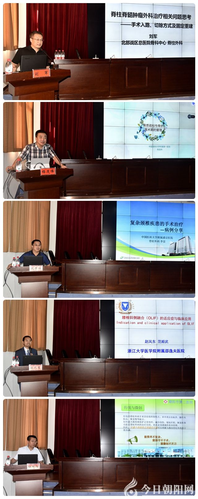 接下來,進(jìn)入了學(xué)術(shù)講座環(huán)節(jié)。北部戰(zhàn)區(qū)總醫(yī)院骨科副主任劉軍、中國醫(yī)科大學(xué)附屬第一醫(yī)院骨科主任醫(yī)師楊茂偉、中國醫(yī)科大學(xué)附屬盛京醫(yī)院脊柱外科副主任醫(yī)師段景柱、浙江大學(xué)醫(yī)學(xué)院附屬邵逸夫醫(yī)院骨科副主任趙鳳東、市二院微創(chuàng)脊柱外科主任杜向陽5位專家,分別以《脊柱脊髓腫瘤外科治療相關(guān)問題思考》《骨質(zhì)疏松性骨折圍術(shù)期的管理》《復(fù)雜頸椎疾患的手術(shù)治療》《腰椎斜側(cè)融合(OLIF)的適應(yīng)癥與臨床應(yīng)用》《淺談椎間盤鏡技術(shù)(MED)在腰椎退變性疾病中的應(yīng)用》為題,進(jìn)行了精彩的講解。