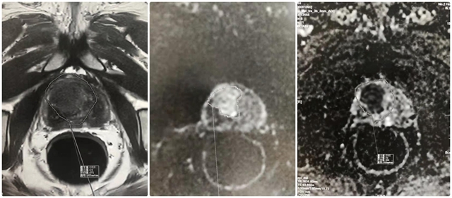 患者李某,家住朝陽市區(qū),因“尿頻、排尿困難進行性加重1年”來到泌尿外科就診,化驗結(jié)果顯示前列腺腫瘤標記物輕度升高,肛門指診無異常,建議住院進行系統(tǒng)檢查?;颊呷朐汉?,該科實施了多參數(shù)MRI檢查,發(fā)現(xiàn)前列腺中央腺異常信號,病灶距離外周腺體較遠,如進行常規(guī)系統(tǒng)經(jīng)直腸超聲引導(dǎo)穿刺,漏穿可能性非常高。在此情形下,該科在穿刺過程中通過多參數(shù)MRI圖像融合超聲影像精準定位病變區(qū),自由臂引導(dǎo)穿刺針準確到達病灶區(qū)域穿刺3針,后又行常規(guī)前列腺系統(tǒng)穿刺10針。術(shù)后,病理回報影像異常區(qū)域3針、病理2針為前列腺癌,其余均為前列腺增生。