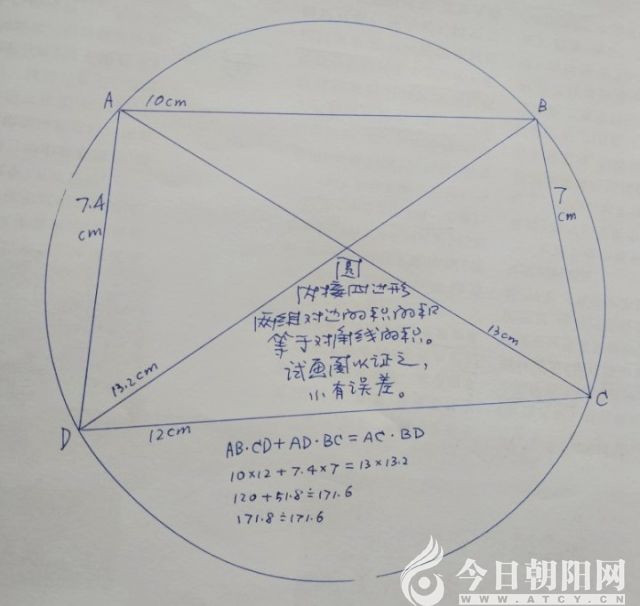 次日,青山一發(fā)找來一個(gè)圓形器皿蓋兒畫了個(gè)圓,拿刻度尺畫了個(gè)圓內(nèi)接四邊形,再畫上對(duì)角線,度量,計(jì)算,驗(yàn)證……不會(huì)證明就得實(shí)測(cè)。