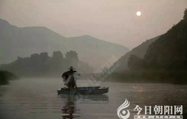 凌水清清,薄霧蒙蒙,孤舟蓑笠,移船而行。白云悠悠,旭日圓圓,心存牽念,寄語山巒。