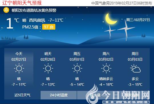 今天是2019年2月27日,星期三,農(nóng)歷正月二十三,“八九”第五天。遼寧朝陽(yáng)晴,氣溫-7~11℃,西風(fēng)3~5級(jí),空氣質(zhì)量良好。日出時(shí)間:06:39;日落時(shí)間:17:45。