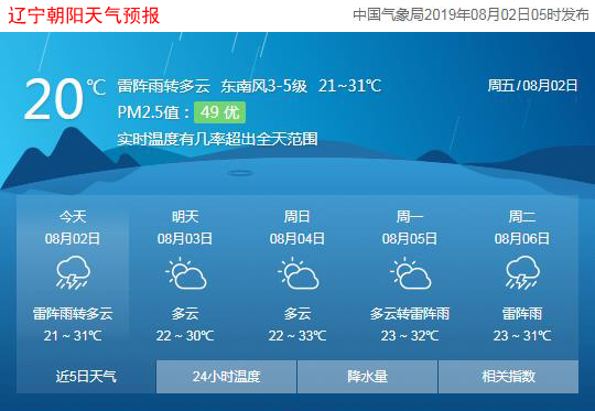 今天是2019年8月2日,星期五,農(nóng)歷七月初二,中伏第十二天。遼寧朝陽(yáng)雷陣雨轉(zhuǎn)多云,氣溫21~31℃,東南風(fēng)3~5級(jí),空氣質(zhì)量?jī)?yōu)。日出時(shí)間:04:52;日落時(shí)間:19:16。(數(shù)據(jù)來(lái)源于中國(guó)氣象局2019年08月02日05時(shí)發(fā)布,請(qǐng)隨時(shí)關(guān)注天氣變化)