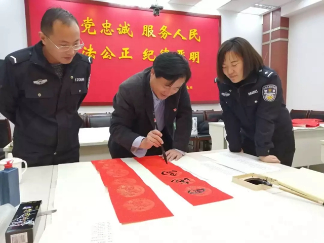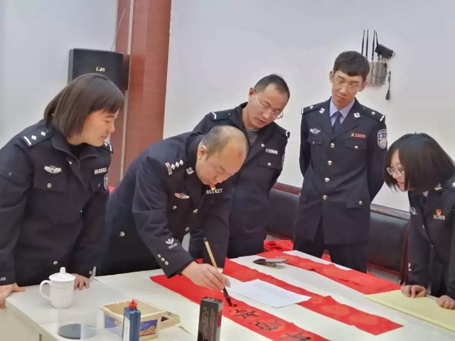 活動(dòng)中,警營(yíng)書法愛(ài)好者現(xiàn)場(chǎng)書寫春聯(lián)及“福”字400余幅,為現(xiàn)場(chǎng)的基層民警及辦事群眾送上了新春祝福,為基層民警送去了市局黨委的親切關(guān)懷,更獲得了現(xiàn)場(chǎng)群眾的一致好評(píng)。