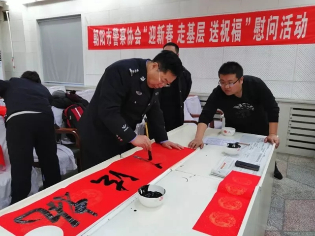 1月30日、31日,遼寧省朝陽(yáng)市警察協(xié)會(huì)積極組織警營(yíng)書法愛(ài)好者趕赴五縣(市)局開展“迎新春 走基層 送祝福”慰問(wèn)活動(dòng)。市警察協(xié)會(huì)秘書長(zhǎng)薛文海、交警支隊(duì)退休民警張憲忠及來(lái)自各縣(市)局的警營(yíng)書法愛(ài)好者參加了慰問(wèn)活動(dòng)。