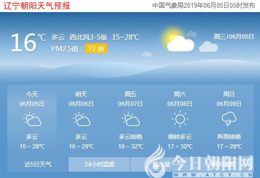 今天是2019年6月5日,星期三,農(nóng)歷五月初三。遼寧朝陽(yáng)多云,氣溫15~28℃,西北風(fēng)3~5級(jí),空氣質(zhì)量良好。日出時(shí)間:04:26;日落時(shí)間:19:28。