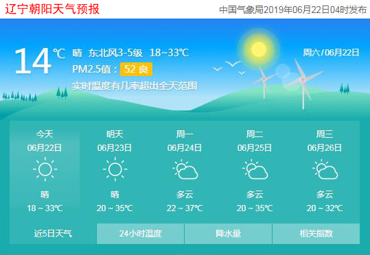 今天是2019年6月22日,星期六,農(nóng)歷五月二十。遼寧朝陽晴,氣溫18~33℃,東北風(fēng)3~5級,空氣質(zhì)量良好。日出時(shí)間:04:24;日落時(shí)間:19:36。(數(shù)據(jù)來源于中國氣象局2019年06月22日4時(shí)發(fā)布,請隨時(shí)關(guān)注天氣變化)