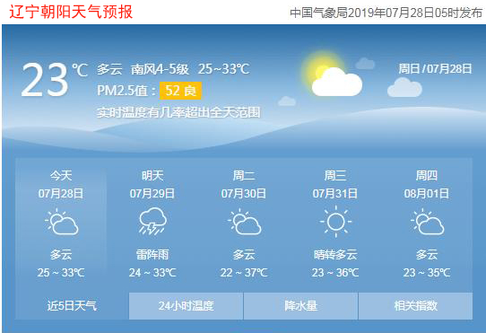 今天是2019年7月28日,星期日,農(nóng)歷六月二十六,中伏第七天。遼寧朝陽多云,氣溫23~33℃,南風(fēng)4~5級,空氣質(zhì)量優(yōu)。日出時間:04:47;日落時間:19:21。(數(shù)據(jù)來源于中國氣象局2019年07月28日05時發(fā)布,請隨時關(guān)注天氣變化)