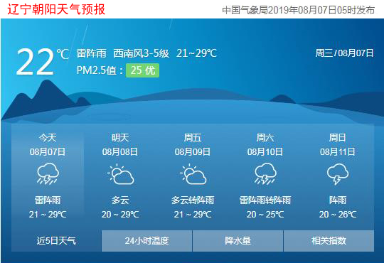 今天是2019年8月7日,星期三,農(nóng)歷七月初七,中國民間的傳統(tǒng)節(jié)日七夕節(jié),中伏第十七天。遼寧朝陽雷陣雨,氣溫21~29℃,西南風3~5級,空氣質(zhì)量優(yōu)。日出時間:04:57;日落時間:19:10。(數(shù)據(jù)來源于中國氣象局2019年08月07日05時發(fā)布,請隨時關(guān)注天氣變化。)