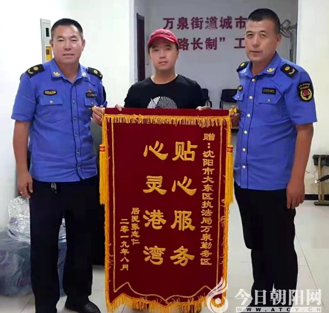 2019年8月28日,一面印有“貼心服務 心靈港灣”的大紅錦旗送到了沈陽市大東區(qū)執(zhí)法局萬泉勤務區(qū)。這是居民張志仁執(zhí)意要送給及時救助老父親的特勤隊員的,以此來表達內(nèi)心的感激之情。