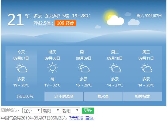 今天是2019年9月7日,星期六,農(nóng)歷八月初九。遼寧朝陽(yáng)多云,氣溫19~28℃,東北風(fēng)3~5級(jí),空氣質(zhì)量輕度污染。日出時(shí)間:05:28;日落時(shí)間:18:24。(數(shù)據(jù)來(lái)源于中國(guó)氣象局2019年09月07日05時(shí)發(fā)布,請(qǐng)隨時(shí)關(guān)注天氣變化。)