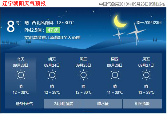 今天是2019年9月23日,星期一,農(nóng)歷八月二十五。遼寧朝陽晴,氣溫12~30℃,西南風(fēng)微風(fēng),空氣質(zhì)量優(yōu)。日出時間:05:44;日落時間:17:56。(數(shù)據(jù)來源于中國氣象局2019年09月23日05時發(fā)布,請隨時關(guān)注天氣變化。)