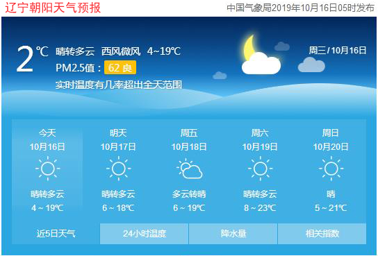 今天是2019年10月16日,星期三,農(nóng)歷九月十八。遼寧朝陽(yáng)晴轉(zhuǎn)多云,氣溫4~19℃,西南風(fēng)微風(fēng),空氣質(zhì)量良好。日出時(shí)間:06:09;日落時(shí)間:17:18。(中國(guó)氣象局2019年10月16日05時(shí)發(fā)布。)請(qǐng)隨時(shí)關(guān)注天氣變化。