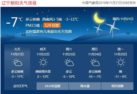 今天是2019年11月21日,星期四,農歷十月二十五。遼寧朝陽晴,氣溫-3~11℃,西南風4~5級,空氣質量輕度污染。日出時間:06:52;日落時間:16:35。(中國氣象局2019年11月21日05時發(fā)布)請隨時關注天氣變化。