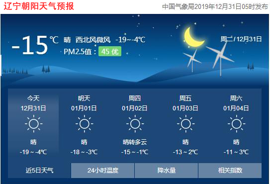 今天是2019年12月31日,星期二,農(nóng)歷臘月初六,二九第一天。遼寧朝陽(yáng)晴,氣溫-19~-4℃,西南風(fēng)3~5級(jí),空氣質(zhì)量?jī)?yōu)。日出時(shí)間:07:25;日落時(shí)間:16:38(中國(guó)氣象局2019年12月31日5時(shí)發(fā)布),請(qǐng)隨時(shí)關(guān)注天氣變化。