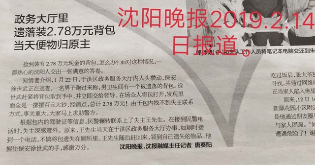 新春伊始,暖意漸濃,來(lái)自遼寧朝陽(yáng)安平集團(tuán)的暖心事更是一件接著一件。1月22日,該集團(tuán)駐沈陽(yáng)市于洪區(qū)政務(wù)服務(wù)中心保安員徐世武拾金不昧的事跡被遼寧都市頻道報(bào)道后,又登在了遼沈晚報(bào)上。報(bào)紙被沈陽(yáng)市政府文明辦有關(guān)負(fù)責(zé)人看到后非常重視,認(rèn)為這種社會(huì)正能量應(yīng)該重視和宣揚(yáng),就特別聯(lián)系于洪區(qū)政府的領(lǐng)導(dǎo),安排遼寧經(jīng)濟(jì)頻道《直播生活》欄目的記者再次采訪。然而,就在記者采訪剛結(jié)束、還沒(méi)出去服務(wù)大廳時(shí),該集團(tuán)保安員李同順又拾到一個(gè)錢(qián)包……