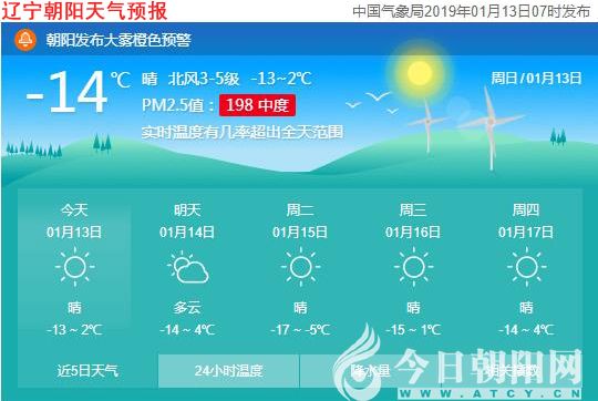 今天是2019年1月13日,星期日,“三九”第五天。遼寧朝陽晴,氣溫-13~2℃,北風3~5級,空氣質(zhì)量中度污染,大家外出時,需做好保護措施。日出時間:07:24;日落時間:16:49。