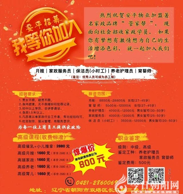 近日,一則喜訊從遼寧朝陽(yáng)安平集團(tuán)傳來,該集團(tuán)的朝陽(yáng)安平物業(yè)管理有限公司加盟了著名家政品牌“管家?guī)?rdquo;。目前,安平物業(yè)正面向社會(huì)招收家政學(xué)員,為學(xué)員提供更專業(yè)更前衛(wèi)的系統(tǒng)培訓(xùn)。悄悄地告訴您,春節(jié)期間優(yōu)惠力度很大喲,詳細(xì)了解一下吧。