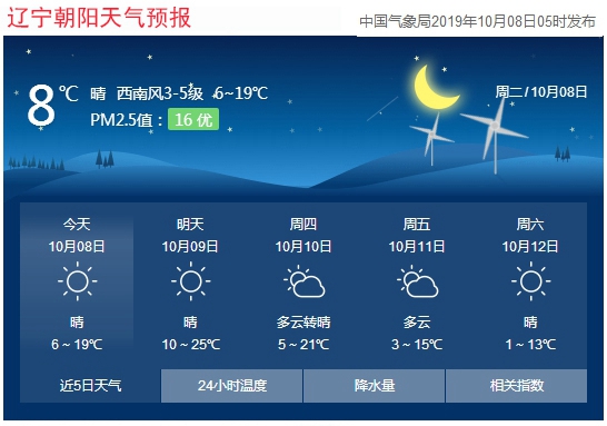 今天是2019年10月8日,星期二,農(nóng)歷九月初十。遼寧朝陽晴,氣溫6~19℃,西北風(fēng)3~5級(jí),空氣質(zhì)量?jī)?yōu)。日出時(shí)間:06:00;日落時(shí)間:17:31。(數(shù)據(jù)來源于中國氣象局2019年10月08日05時(shí)發(fā)布,請(qǐng)隨時(shí)關(guān)注天氣變化。)