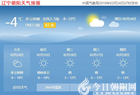 今天是2019年2月24日,星期日,農(nóng)歷正月二十,“八九”第二天。遼寧朝陽多云,氣溫-8~10℃,北風(fēng)3~5級(jí),空氣質(zhì)量良好。日出時(shí)間:06:44;日落時(shí)間:17:41。