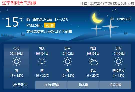 今天是2019年9月30日,星期一,農(nóng)歷九月初二。遼寧朝陽晴,氣溫17~32℃,西南風(fēng)3~5級,空氣質(zhì)量良好。日出時(shí)間:05:52;日落時(shí)間:17:44。(數(shù)據(jù)來源于中國氣象局2019年09月30日05時(shí)發(fā)布,請隨時(shí)關(guān)注天氣變化。)
