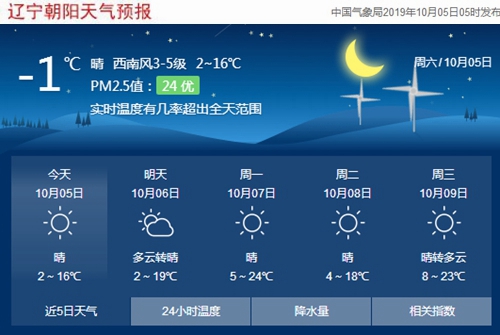 今天是2019年10月5日,星期六,農(nóng)歷九月初七。遼寧朝陽晴,氣溫2~16℃,北風(fēng)3~5級,空氣質(zhì)量優(yōu)。日出時(shí)間:05:57;日落時(shí)間:17:36。(數(shù)據(jù)來源于中國氣象局2019年10月05日05時(shí)發(fā)布,請隨時(shí)關(guān)注天氣變化。)