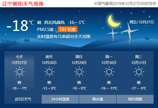 今天是2019年12月27日,星期五,農(nóng)歷臘月初二,一九第六天。遼寧朝陽(yáng)晴,氣溫-16~-1℃,西南風(fēng)微風(fēng),空氣質(zhì)量輕度污染。日出時(shí)間:07:22;日落時(shí)間:16:34(中國(guó)氣象局2019年12月27日5時(shí)發(fā)布),請(qǐng)隨時(shí)關(guān)注天氣變化。
