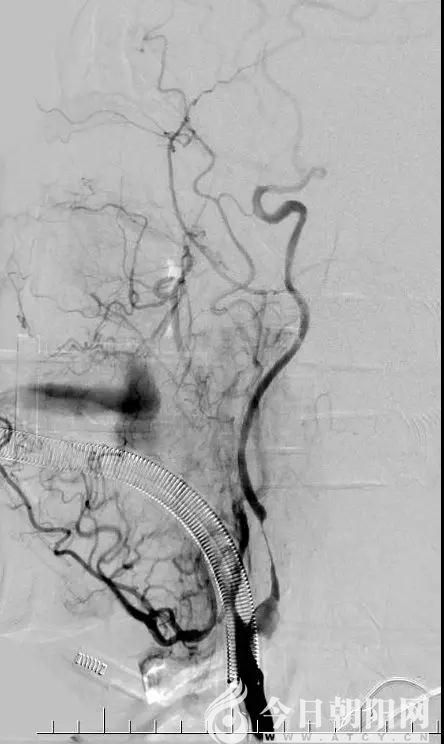 取栓后造影顯示頸內動脈為通暢,但仍有嚴重狹窄,應用藥物防止再次閉塞。