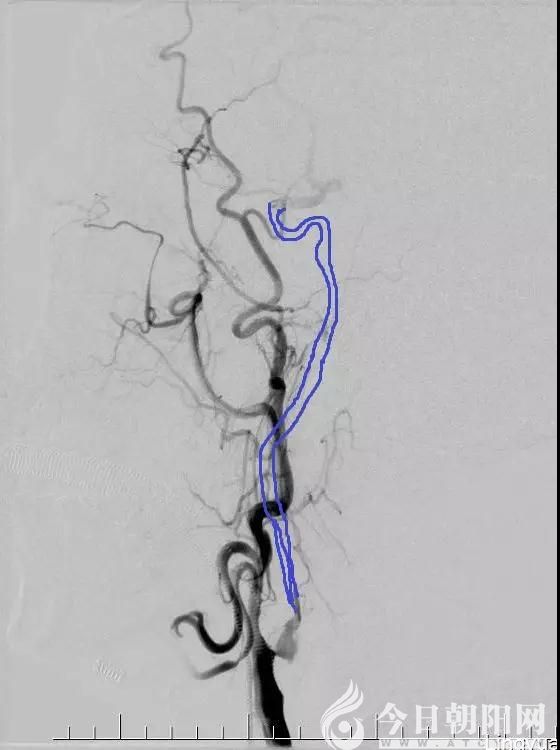 術前顯示頸內動脈起始段閉塞,藍筆所標識部位為正常頸內動脈的走行情況。